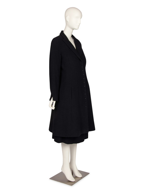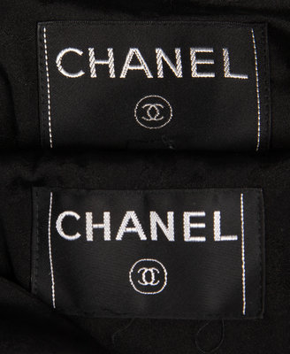 The coat is made of the same material as the jacket and skirt. and is cut with a similar pattern as the jacket, with vertical panels, raglan sleeve, and a center front black pearl-like button closure. The coat is lined with a black silk woven with flowers and CC logos.