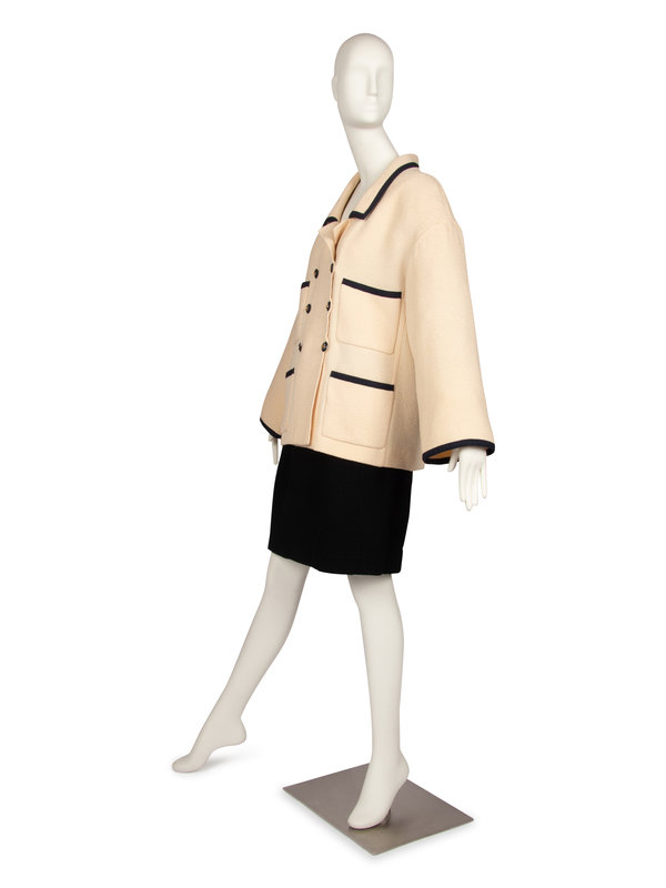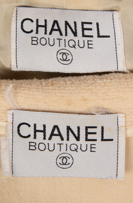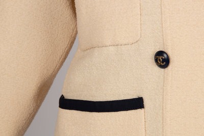 Cream boucle fabric cardigan style jacket with front four pockets, and center front six logo button closure.