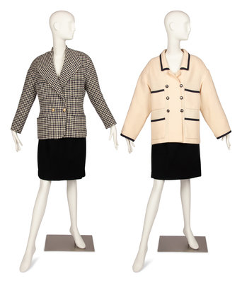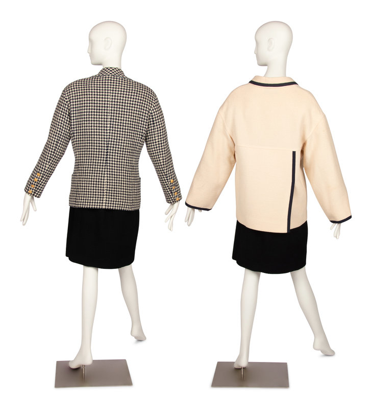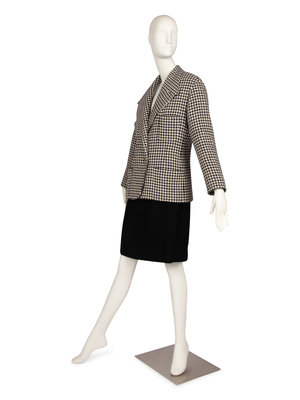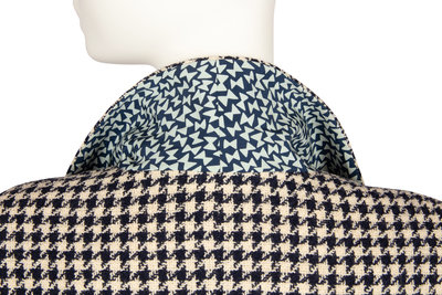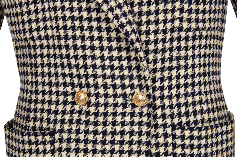 Navy and white hound's-tooth double breasted jacket with exaggerated peaked lapels with four pockets and logo gold-tone buttons. The collar and the pocket bags are lined in a blue silk bow fabric.