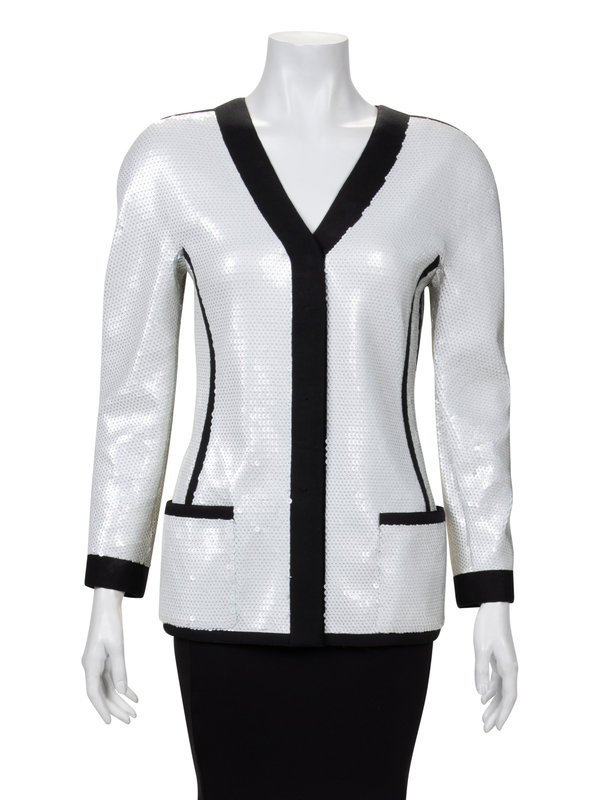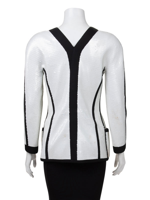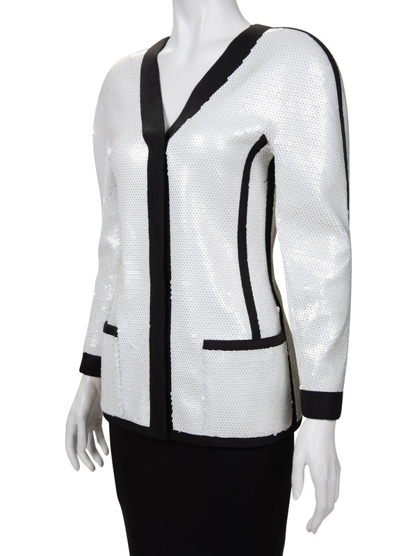 White cardigan style sequined jacket with black grosgrain ribbon trim, two front patch pockets, and a front zip closure. Collection 25; 1991 Scuba Jacket.