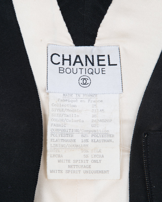 Versions of this jacket featured in the 2005 "Chanel" exhibition at the Metropolitan Museum of Art, in which it was described as 'referencing neoprene wetsuits’. The catalogue also reports that the jacket ‘discloses such typical Chanel details as contrasting grosgrain ribbon to define the jacket's perimeters and articulate its structural seaming'.