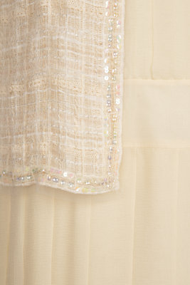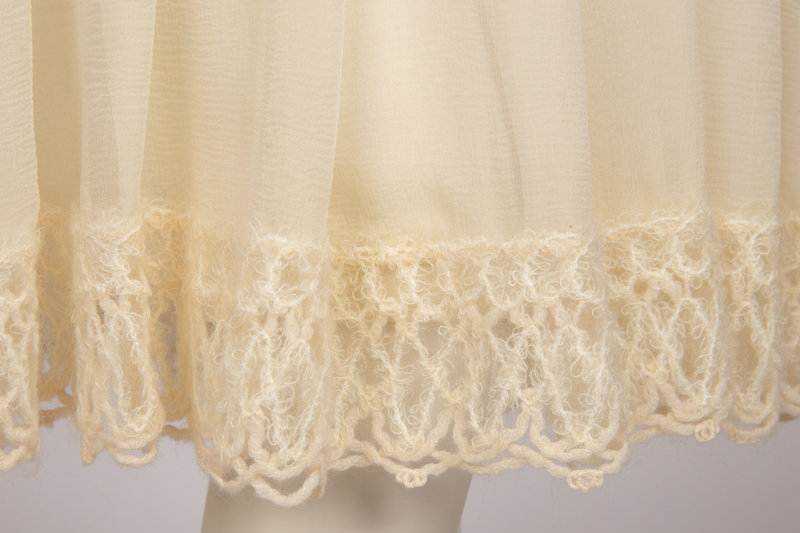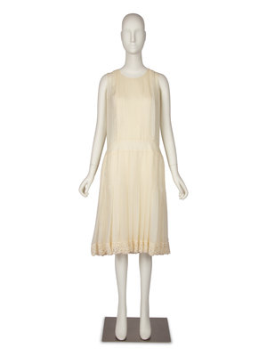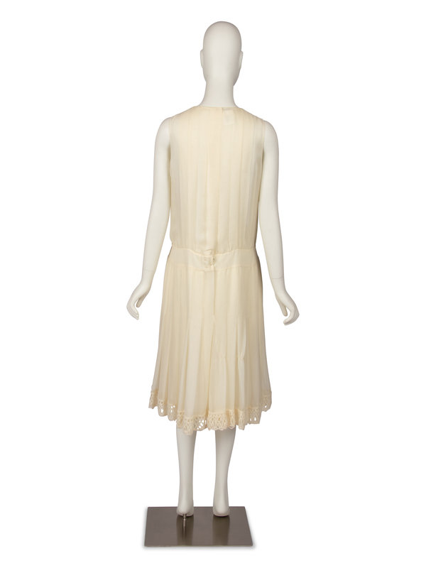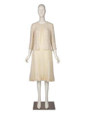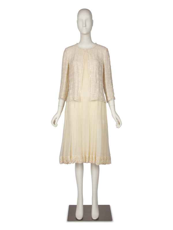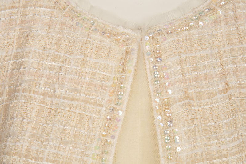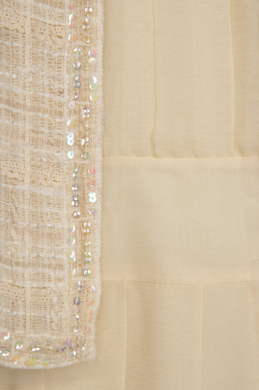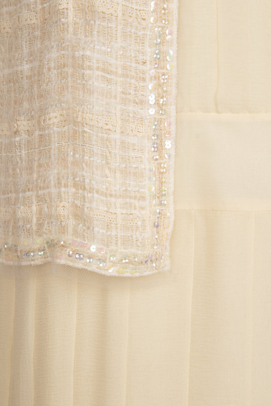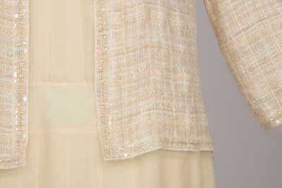 Cream tweed and lace cardigan style jacket with two front pockets, trimmed in iridescent sequins. The chiffon dress has has a drop waist with a pleated skirt trimmed in lace.