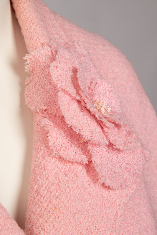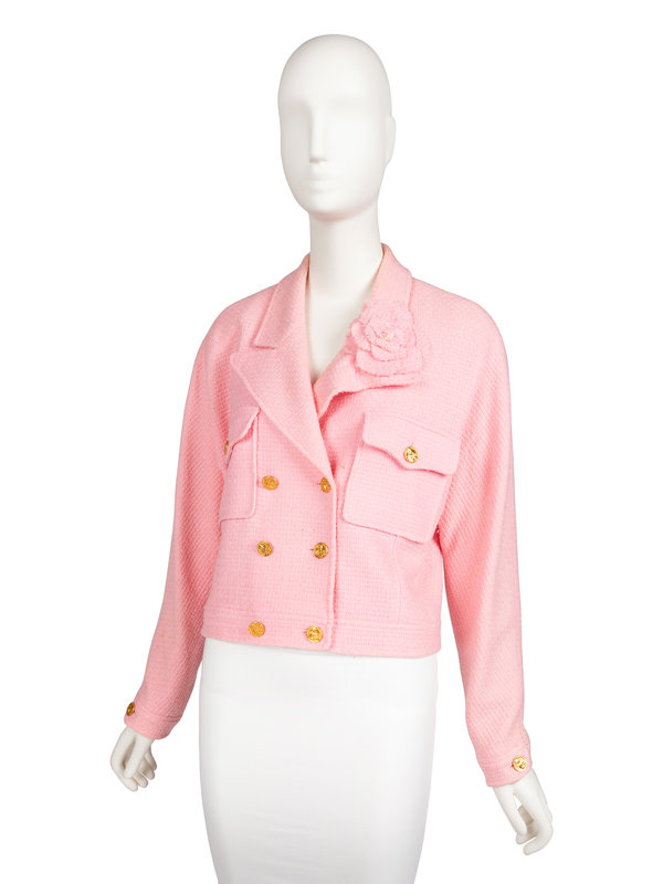 Pink tweed double breasted cropped jacket with notched lapel, long sleeves, two front flap pockets, Camellia flower pin, and front button closure. The gold-tone buttons featured the bust of a woman and the words "Coco Chanel".