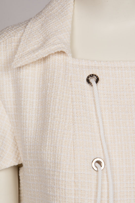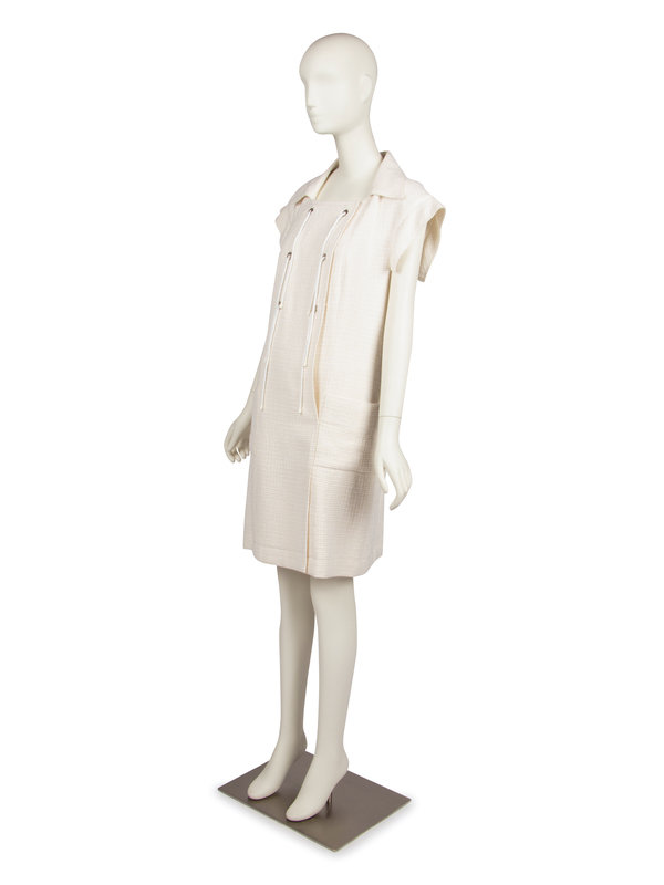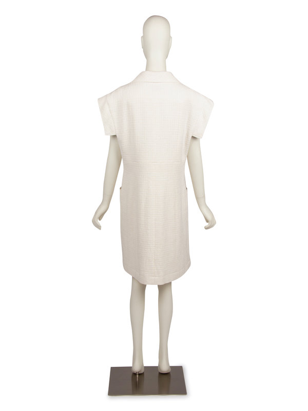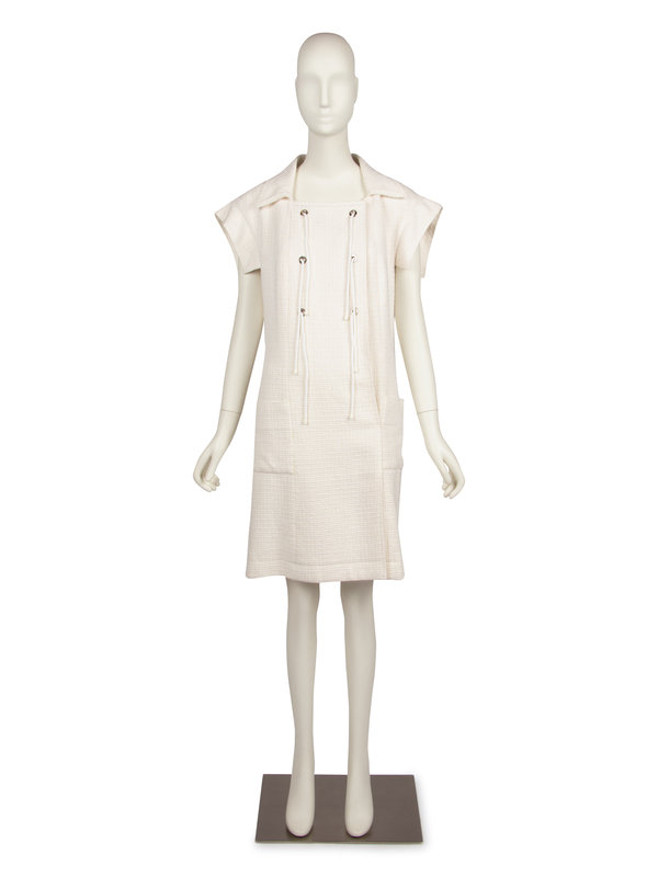White tweed dress with square neckline, spread collar, set in partial open sleeve, two front patch pockets, and corded double-breasted drawstring details down the center front. Comes with replacement fabric swatch, button, and denotes original retail tag with price of $3,210.00.