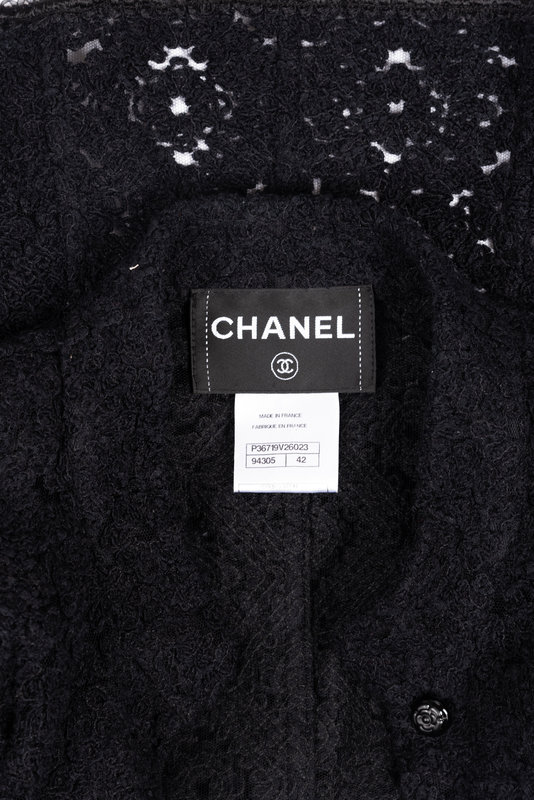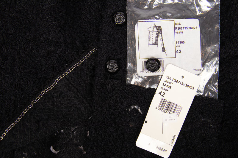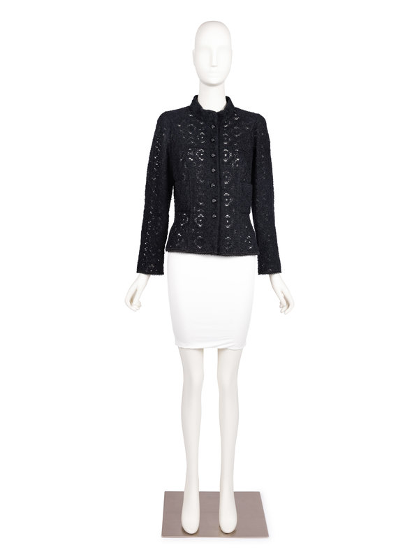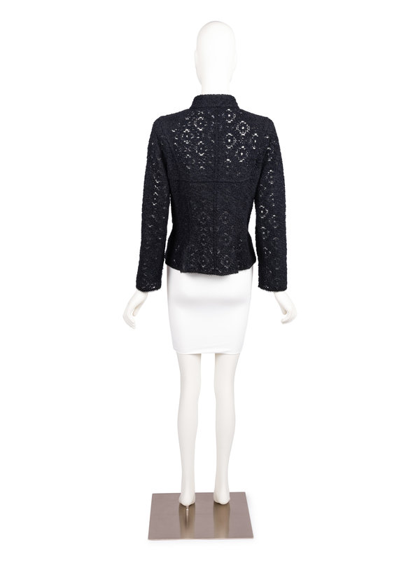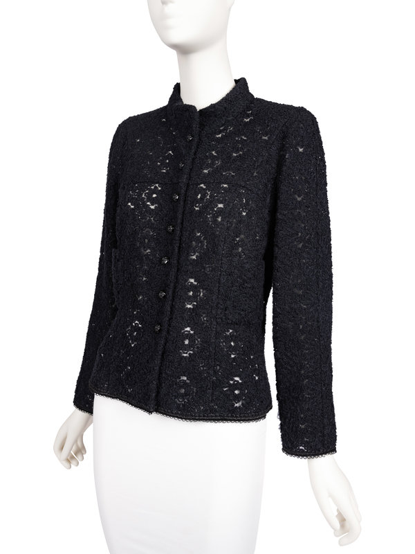 Black, loosely woven fabric design with mandarin collar, set-in long sleeves, two front patch pockets, scalloped lace trim, and center front button closure. The buttons feature a flower. Comes with replacement fabric swatch, button, and denotes original retail tag with price of $6,465.00.