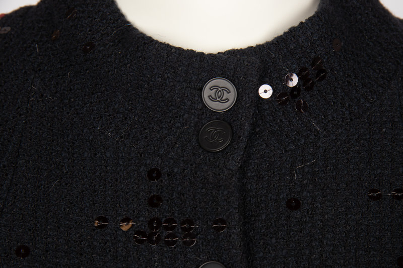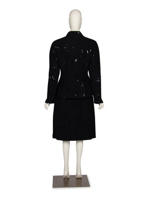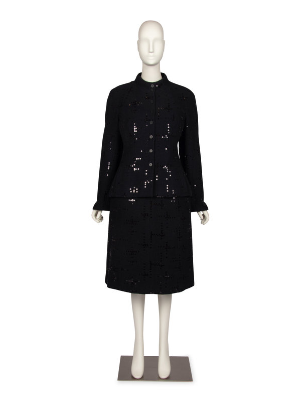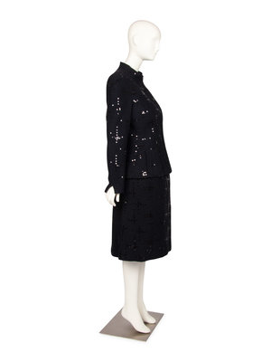 Blue skirt suit with all-over sequin details. The jacket is made with a stand collar, long sleeves, and a center front CC button closure. The straight skirt is fitted into a tight waistband and closes at the center back with a zipper and hook and eye.