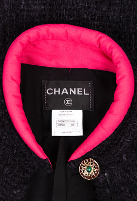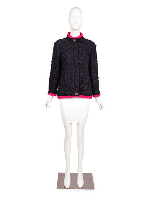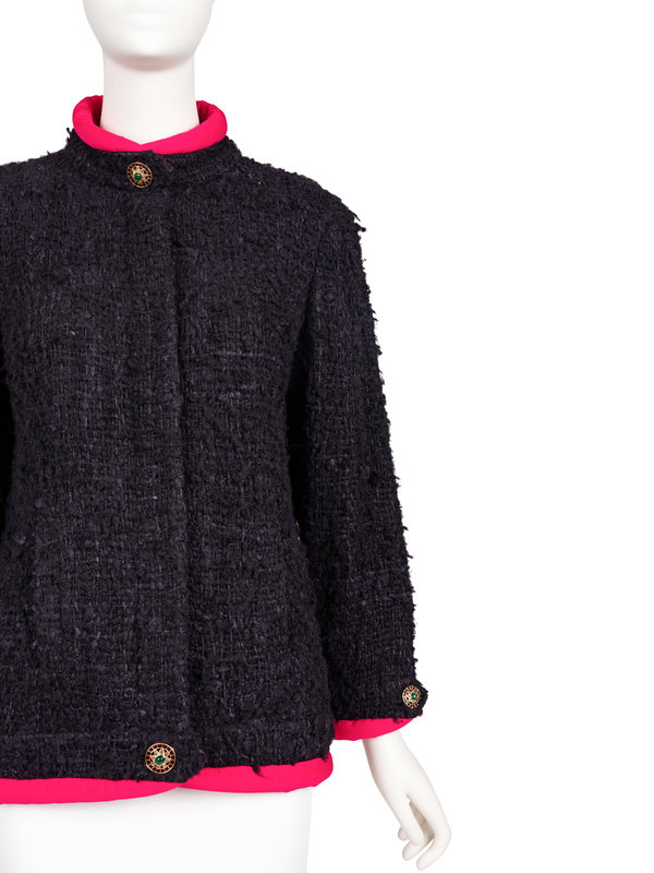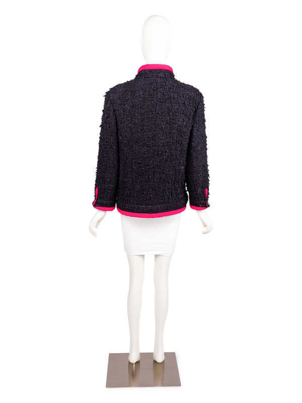 Black tweed jacket with padded pink silk crepe stand-up collar, set in long sleeves, two front slit pockets, and center front zipper closure with two decorative buttons. Sleeves close with the same decorative button as the center front. Comes with original retail tag listing the reduced price of $1,711.00.