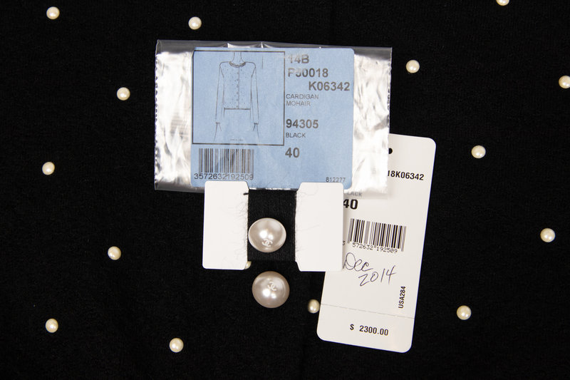 Black mohair knit cardigan with crew neckline, set in long sleeves, ribbed trim, faux pearl detailing, and center front faux pearl button closure. Comes with replacement thread, button and denotes original retail tag with price of $2,300.00.