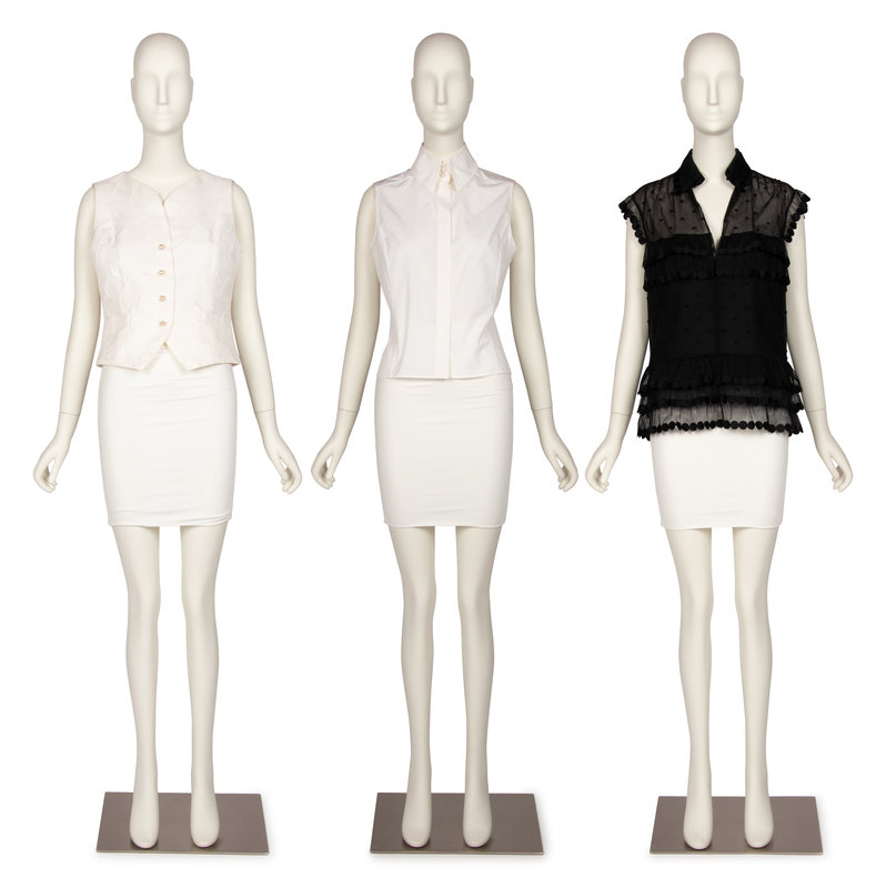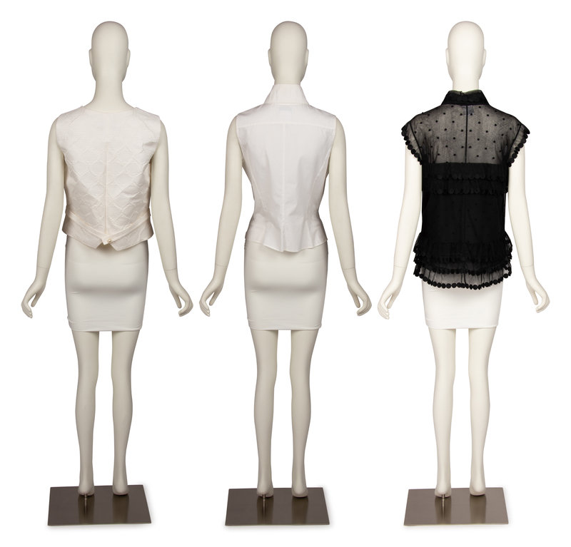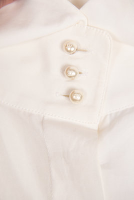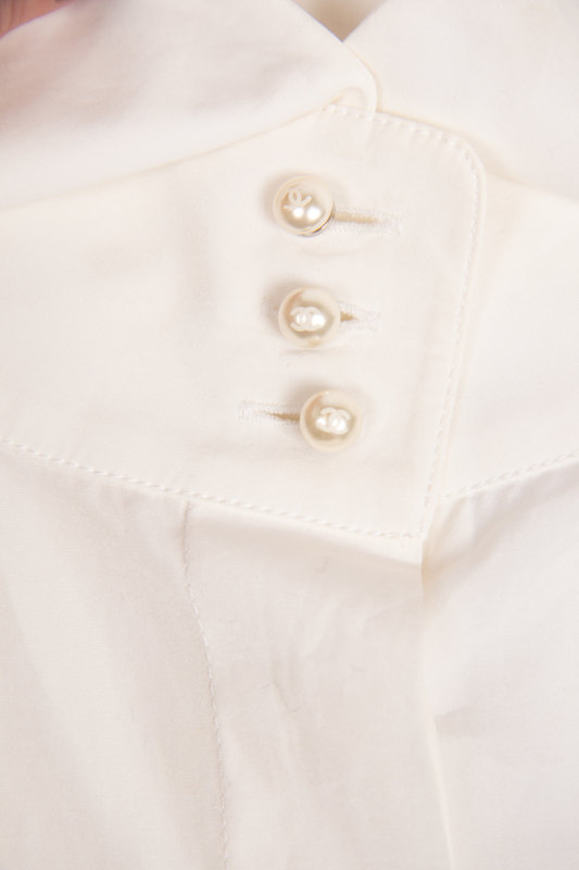 White cotton sleeveless top with pointed collar and center front button closure. The center front neckline closes with three faux pearl Chanel buttons.