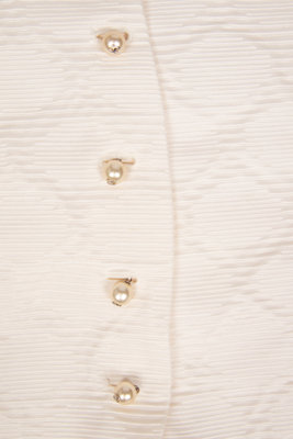 White textured silk sleeveless vest with v-neckline, two front hip welt pockets, center back tie, and front button closure of faux pearl buttons that feature the CC logo. Comes with original retail tag.