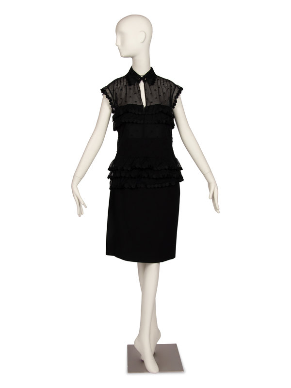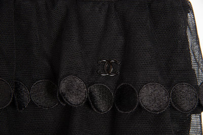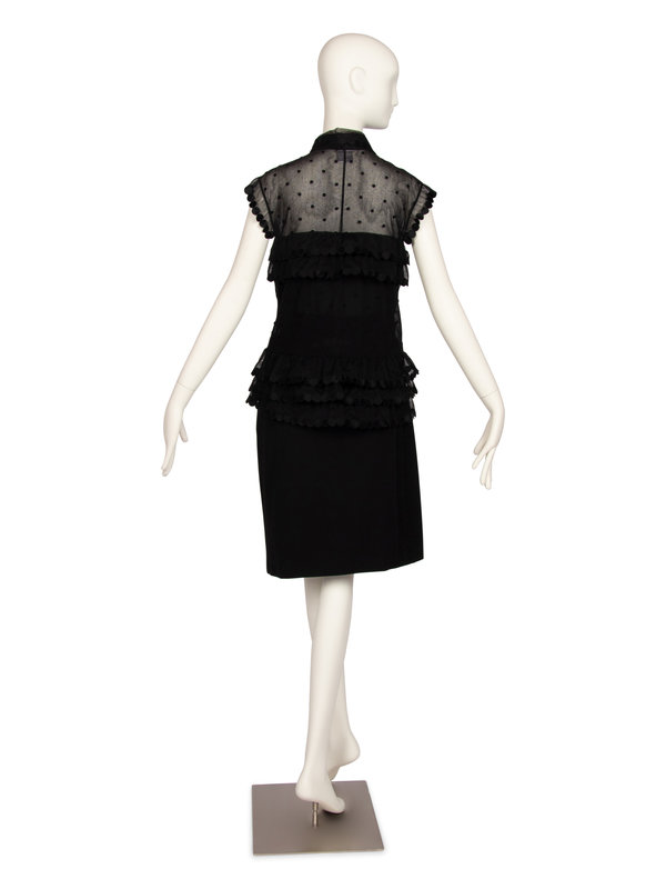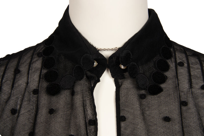 Black cotton sleeveless paneled top with fold-down collar sequired with two cuff-link-like chains at the v-neckline, and netted ruffles with polka-dot detailing.