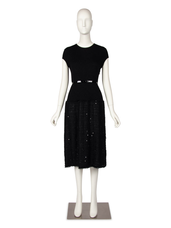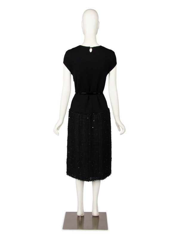 Black knit dress with crew neckline, cap sleeves, woven skirt panel with sequin and silver-tone thread detailing, frayed hem, and invisible side zipper; paired with black patent leather belt with goldtone buckle.