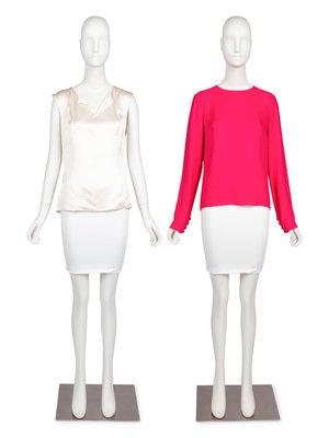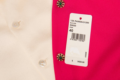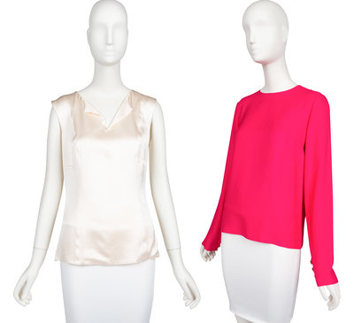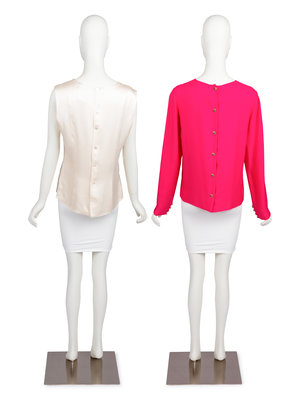Pink silk top with crew neckline, set in long sleeves, and center back button closure. Comes with original retail tag with price of $3,520.00.