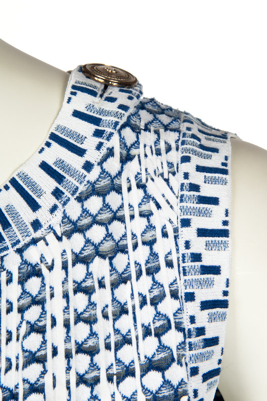 Blue and white cotton/rayon blend sleeveless knit dress with crew neckline, white geometric and floral motif and eyelet detailing, two front patch pockets, keyhole cut out on back of neckline, and shoulder button detailing.
