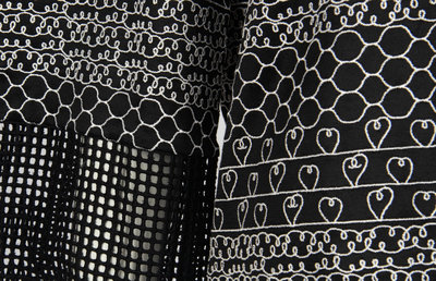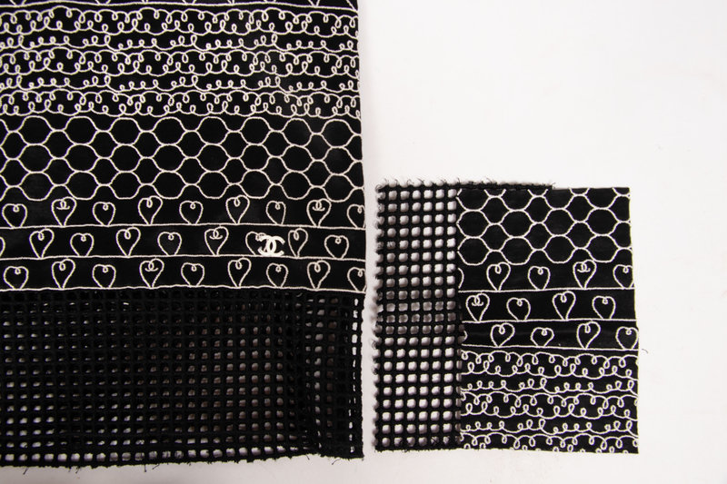 Black rayon/polyester blend long top with wide neckline, long sleeves, white embroidery details throughout, and black eyelet panels. Comes with replacement fabric swatch.