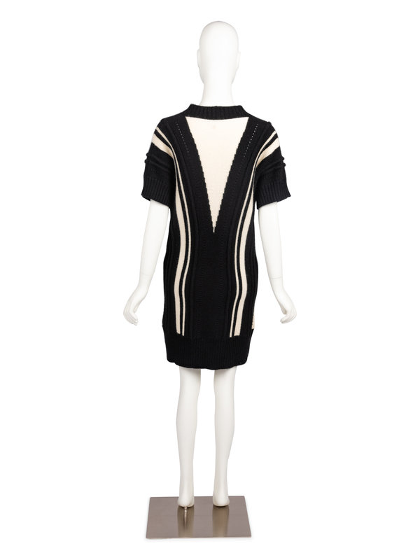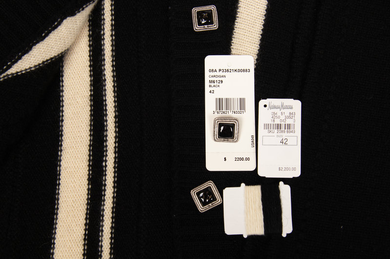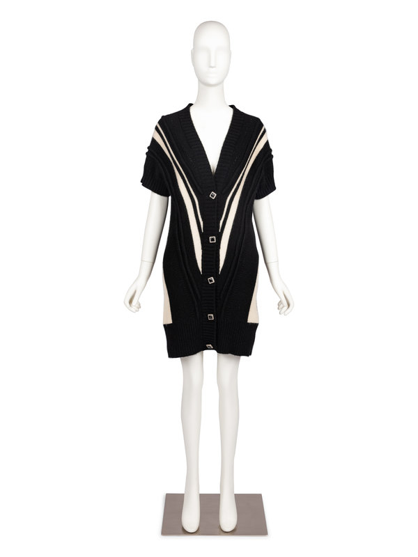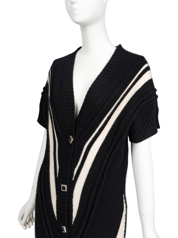 Black cashmere knit long cardigan with v-neckline, short sleeves, ribbed trim, white striped details, and center front button closure. Comes with replacement button, thread, and denotes original retail tag with price of $2,200.00.