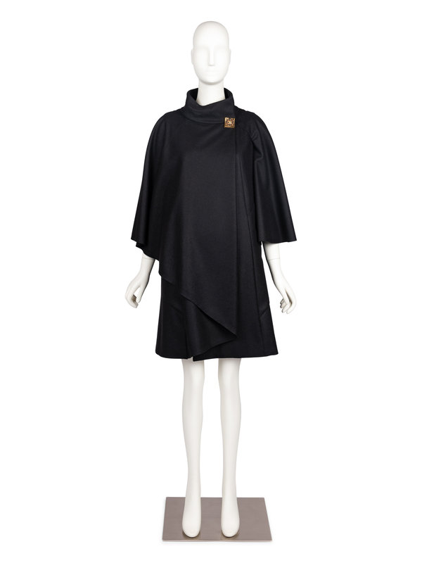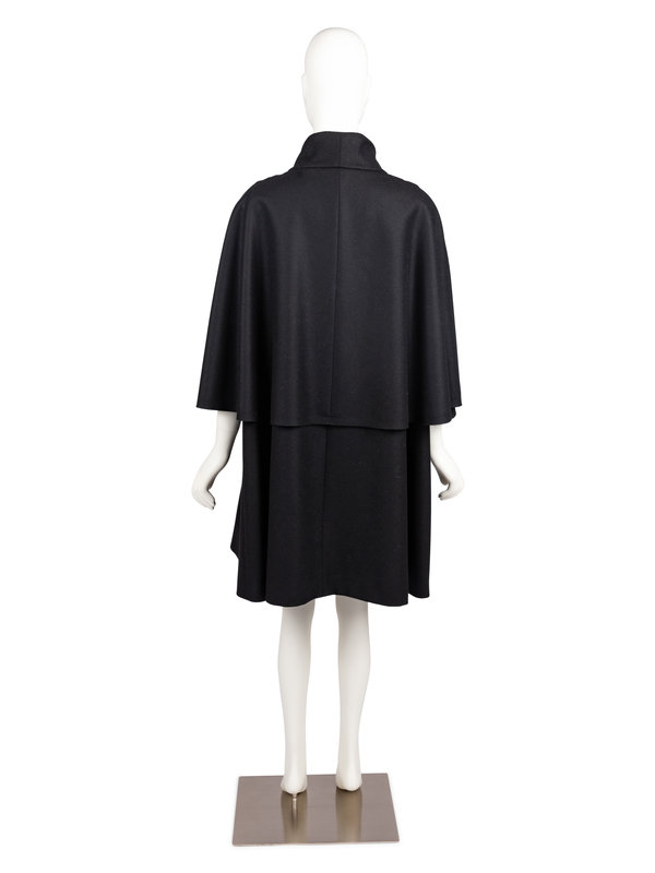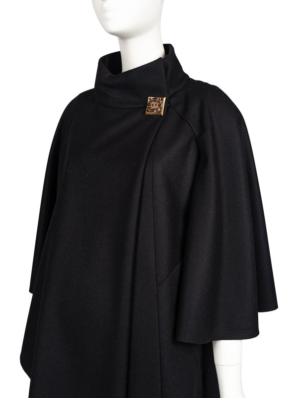 Black wool/cashmere blend jacket with stand up collar, draped and open long sleeves, two front hip welt pockets, and an off-center neck snap closure with button.