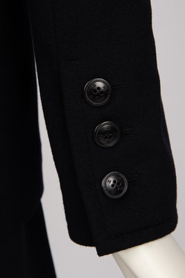 Navy cashmere pea cot with logo buttons. Three logo buttons at the cuffs that are functioning.