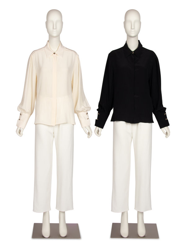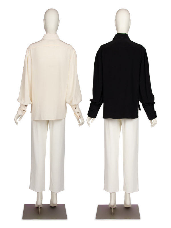 White silk shirt with center front button closure with covered placket. Barrel half rolled cuffs with there logo buttons.