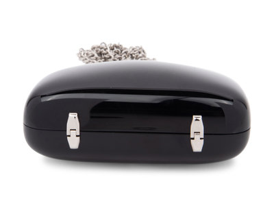 Black plastic bag with logo and Camelia flower backed with metallic leather. The bag retains its original retail tags with a listed price of $1,895.