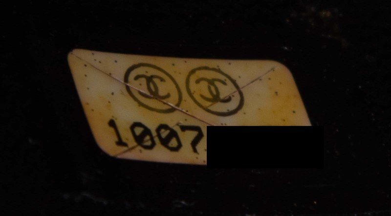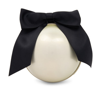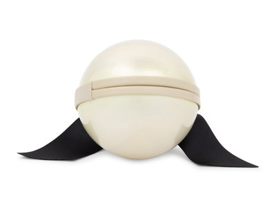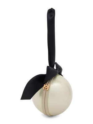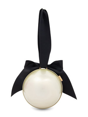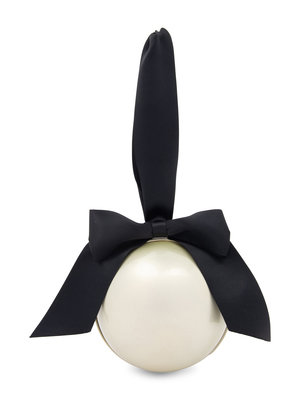 Chanel pearl bag with logo closure and black satin ribbon handle. The piece retains its retail tags with a listed price of $1,450.