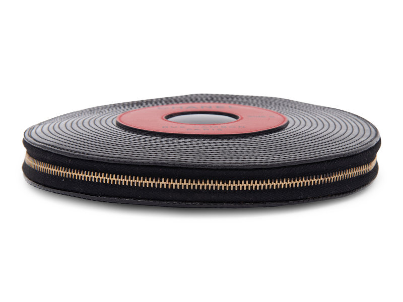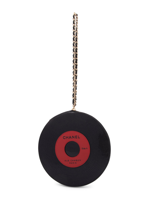 Chanel patent leather bag in the shape of a 45 RPM vinyl with zipper around the bag, matt gold-tone and leather chain handle. The piece retains its retail tags.