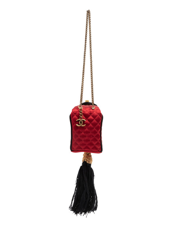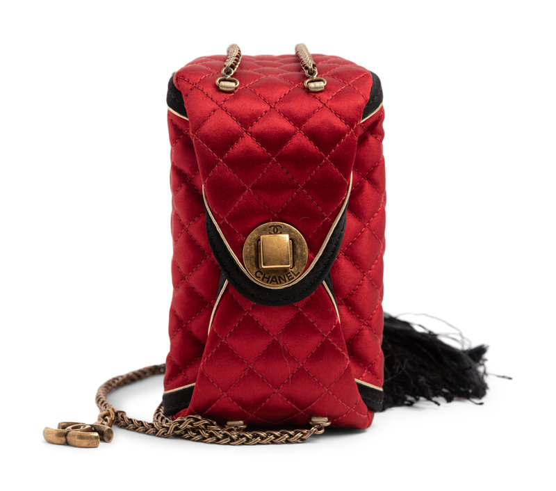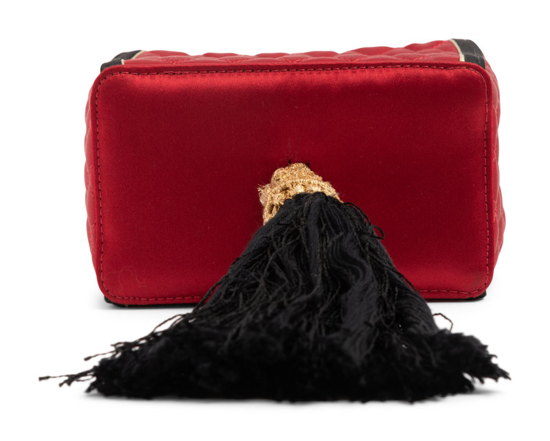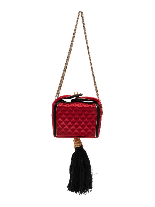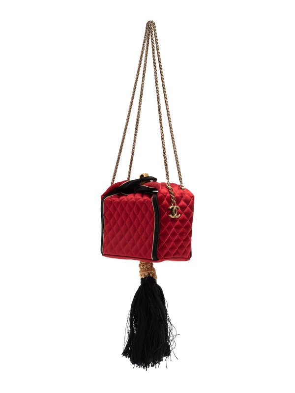 Red quilted satin folding top box shoulder bag trimmed with black satin and gold piping, double gold-tone chain shoulder straps with CC logo charm, bottom black fringe tassel with gold lace knot, and top twist lock closure.