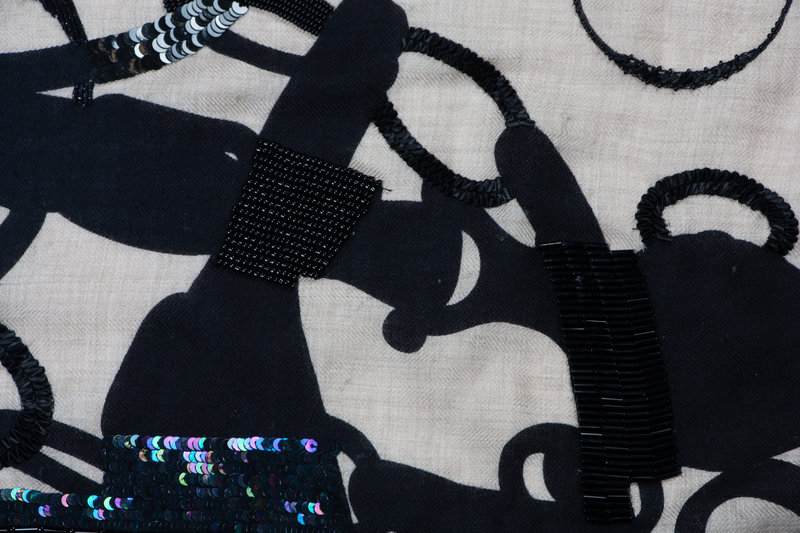 "En Desorde" pattern adaptation by Cyrille Diatkine. The scarf is embroidered with sequins, silk thread, glass beads, and silk ribbon detailing. Year of issue, 2006. The scarf is inspired by the puzzles where an image has been cut into squares and the goal is to place the squares back into place.