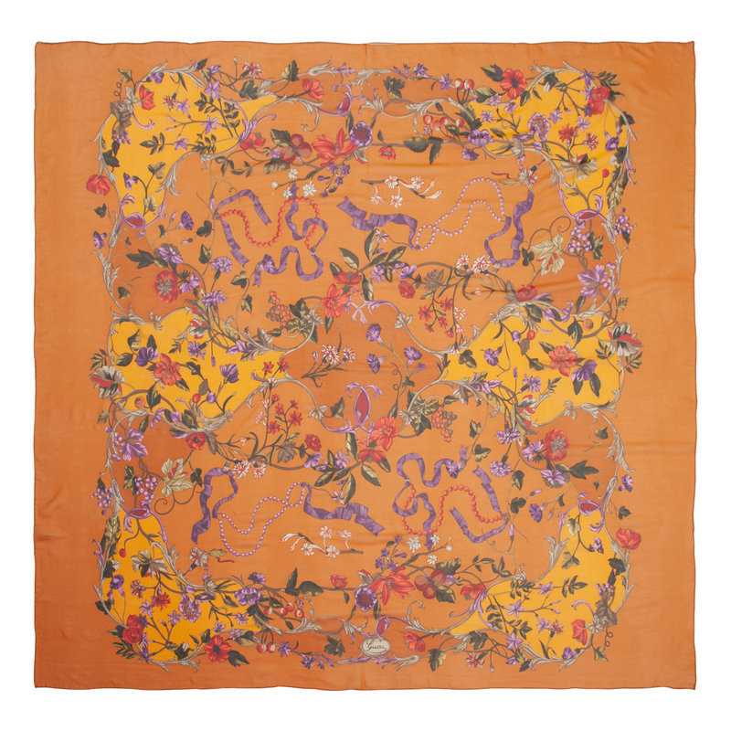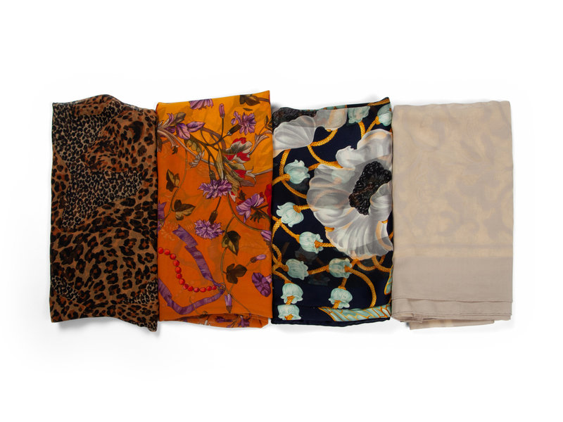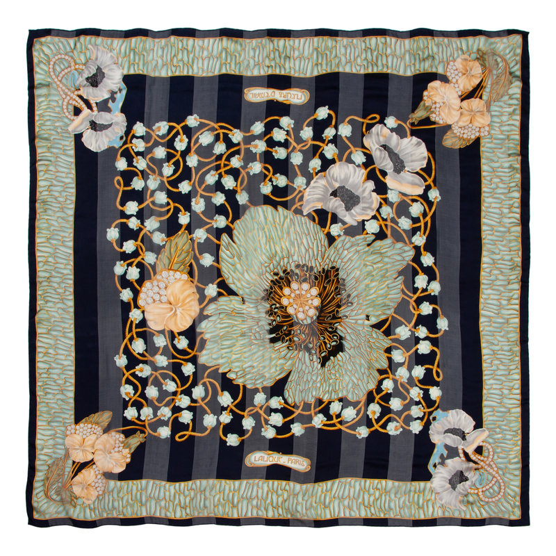 Four Designer Silk Scarves Including Lalique, Gucci, and YSL