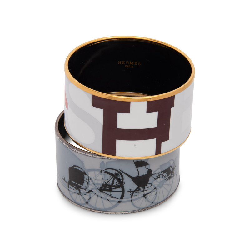 White enamel bangle with multicolored name print and gold-tone trim. Made in Austria + K.