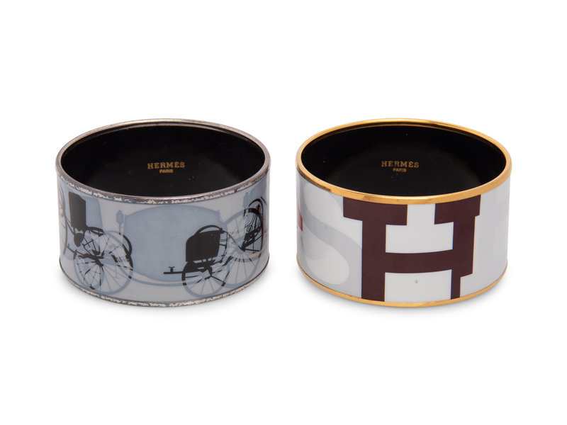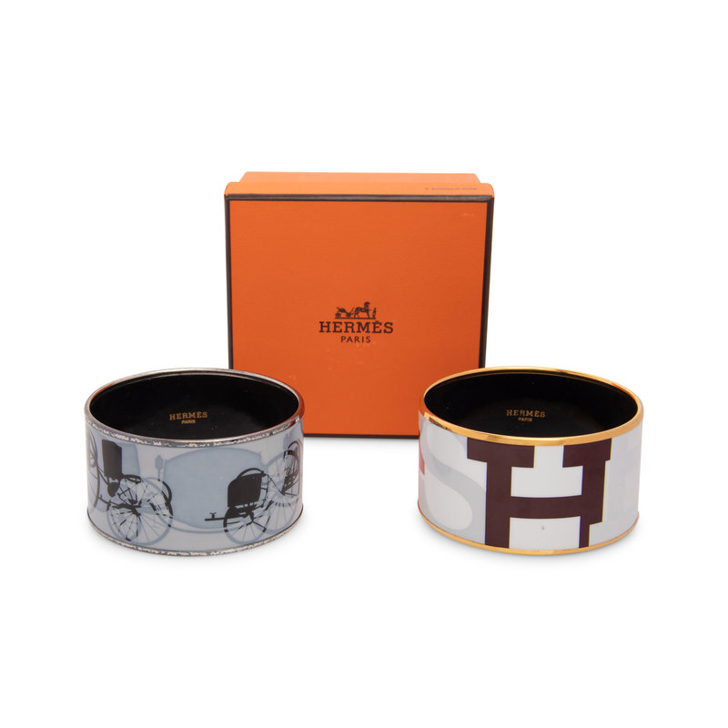 Dual blue enamel bangle with black carriage print and silver-tone trim. Made in Austria + J.