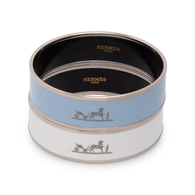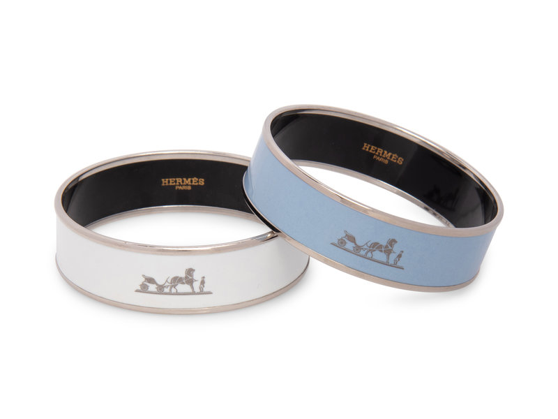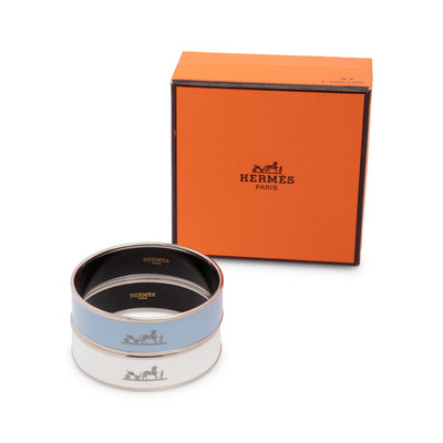 White enamel bangle with silver-tone horse logo print and silver-tone trim. Made in France + N.