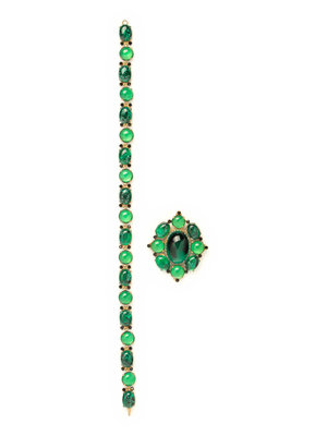 Comprised of alternating translucent green and green and black marbled cabochon synthetic stones, set in gold-tone hardware and accented with black rhinestones. The pendant/brooch contains the same cabochons arranged a larger green and black marbled stone.