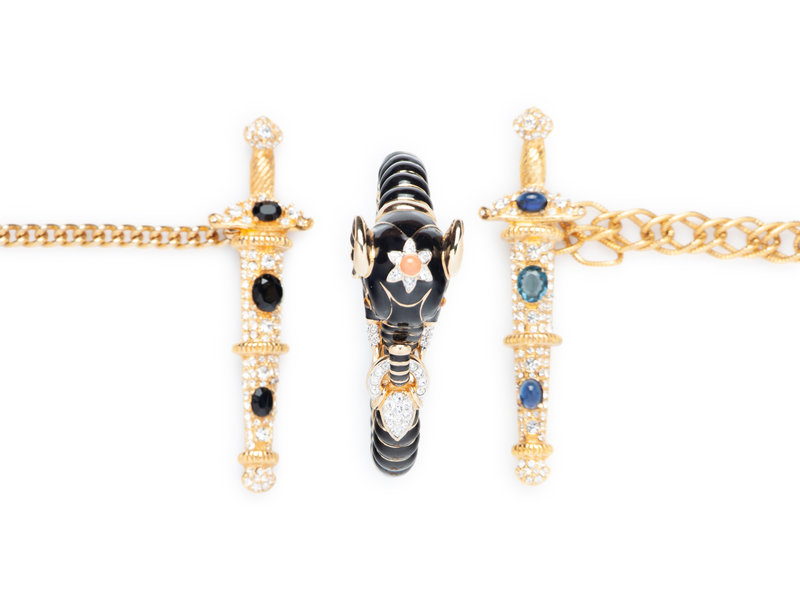 Rhinestone-encrusted double dagger brooch with blue and black stones, and a removable chain conjoining the daggers.