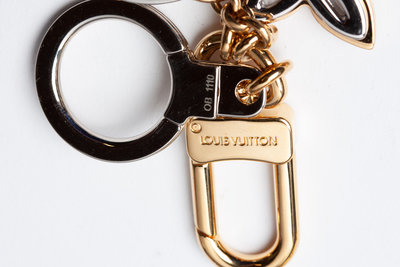 Gold and silver-tone key chain with key ring, D-ring, and two fleur de lis charms.