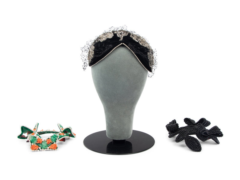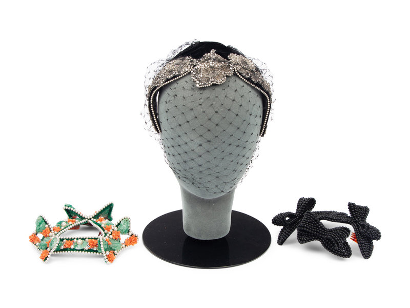 Black beaded three-sided fascinator with beaded bows on each side. Comes with Bes-Ben blue hat box.