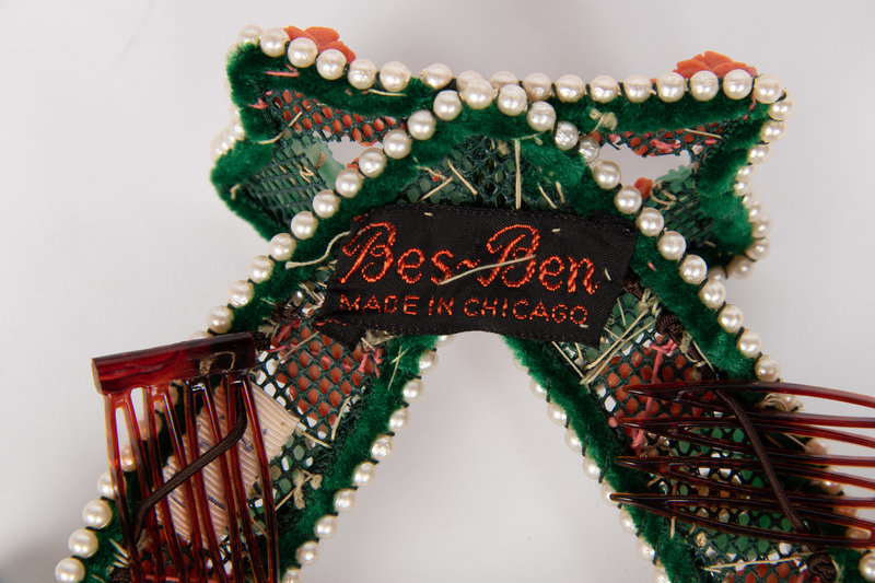 Black velvet shaped crown embellished with glass bead and rhinestone trim in the shape of flowers. The hat is further embellished with a black net veil that hangs over the face. Comes with Bes-Ben blue hat box.