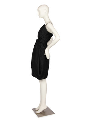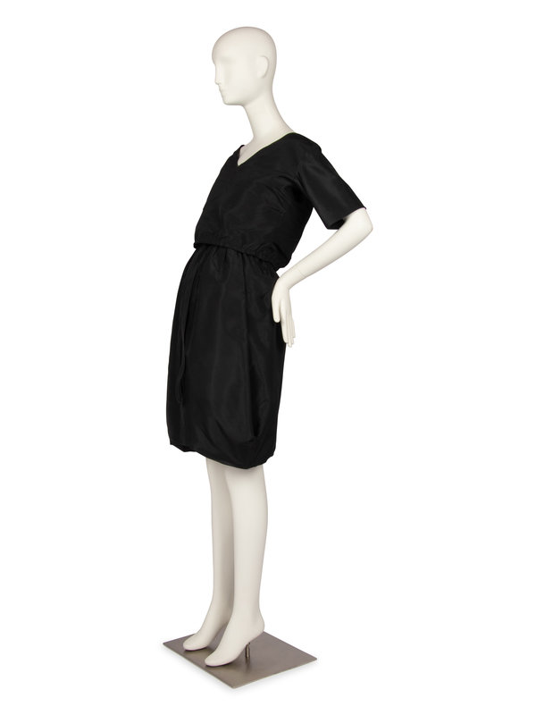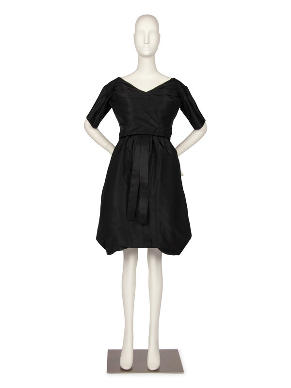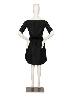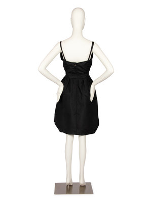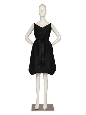 The dress and jacket are made of a black silk taffeta. The dress is made with thin spaghetti straps, a gathered waistband, and full skirt created with deep folds at the sides and a tighter circumference at the hem. The jacket has a wide neckline and detailed patterning around the shoulder. The jacket closes at the center back with snaps, hook and eye, and a elastic waistband.