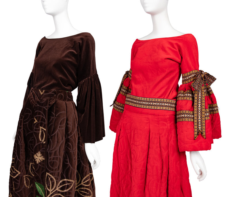 Red velvet top with bateau neckline, quilted bell sleeves with brown geometric embroidered bands and bows, and center back zipper closure; paired with long red velvet quilted skirt with floral top stitching detail, brown geometric embroidered bands towards the bottom and on waist band, and center back zipper closure.
