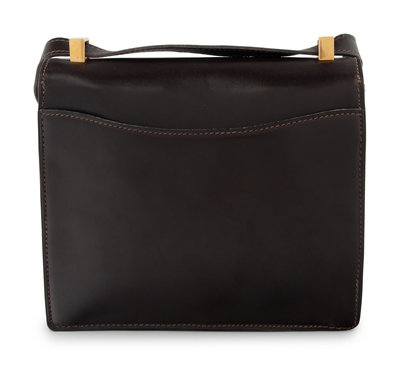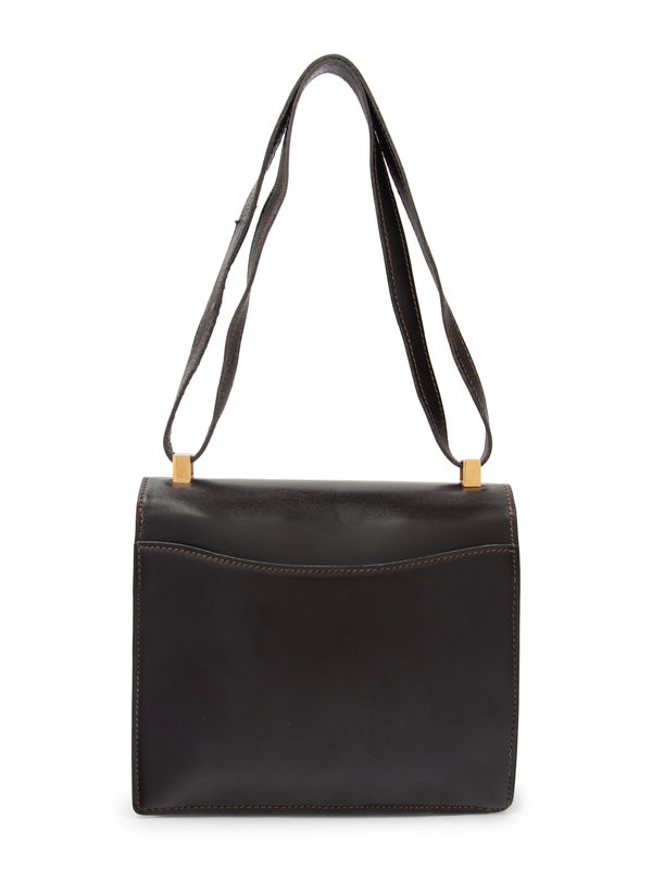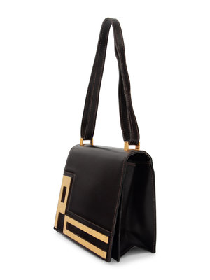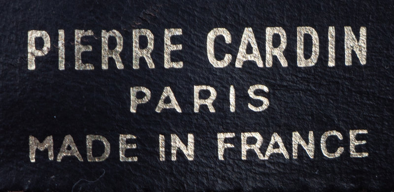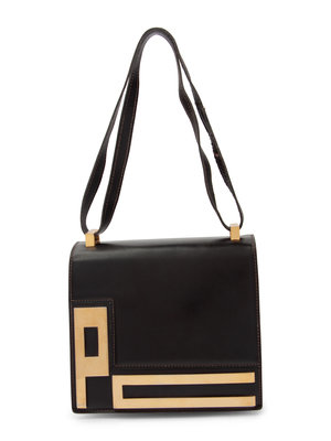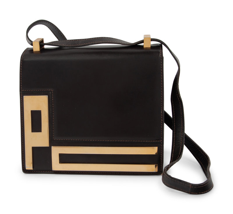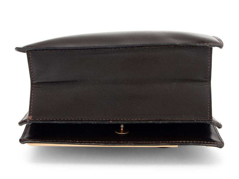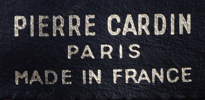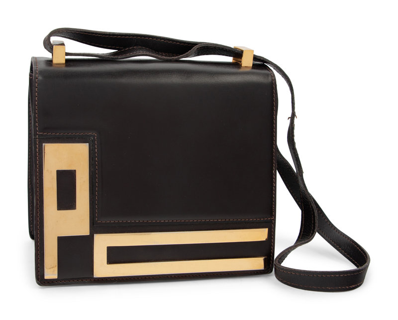 Very dark brown leather shoulder bag with front flap decorated with Pierre Cardin's initals. The leather strap is secured to the bag with goldtone bars at the top.