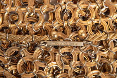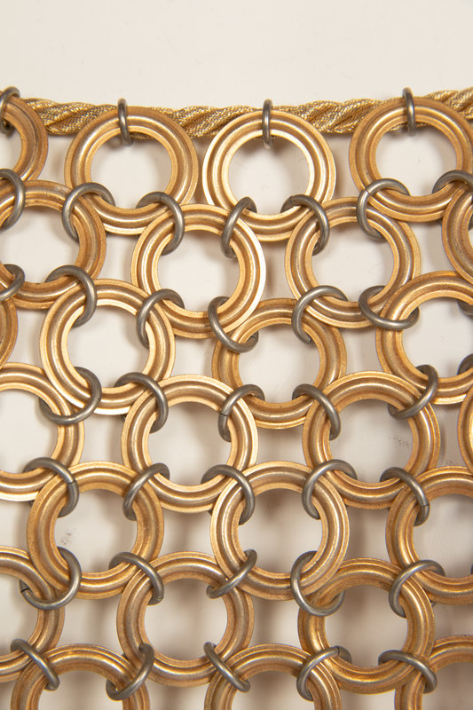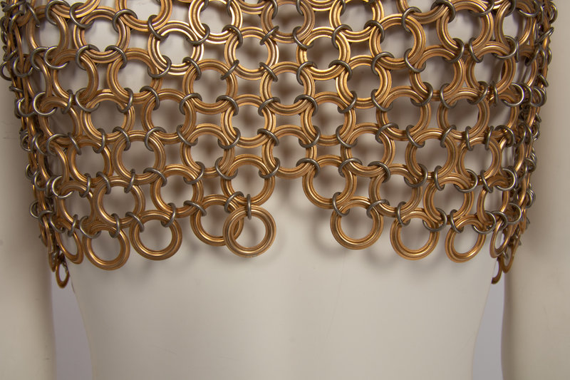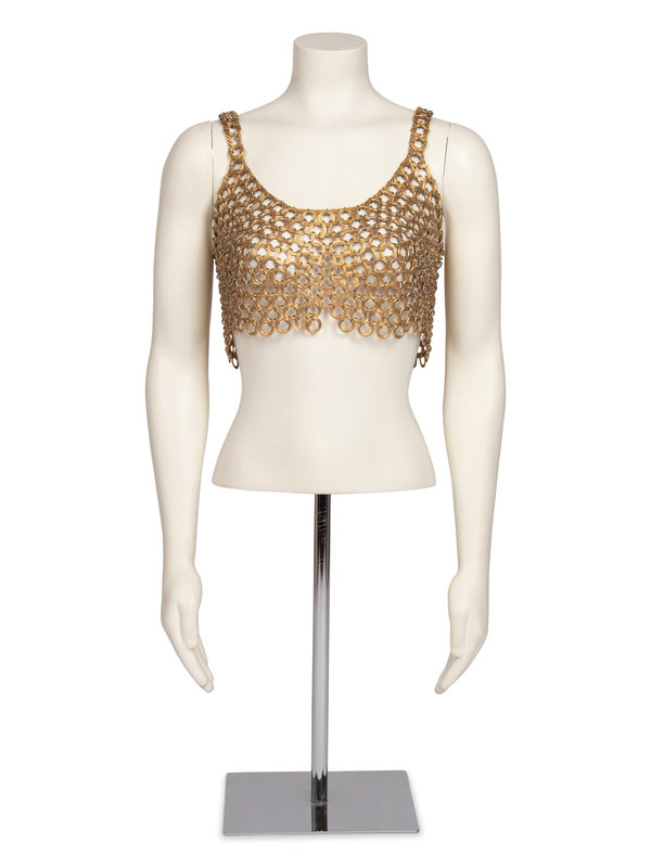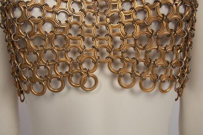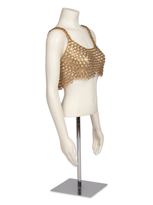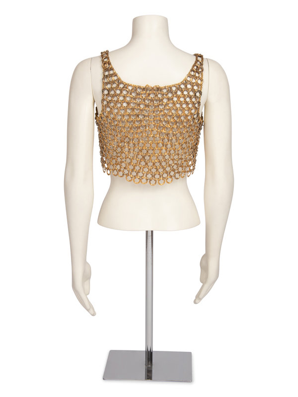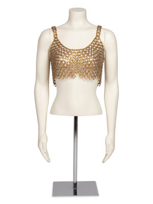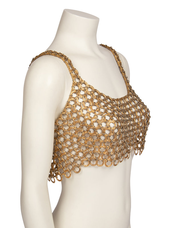 Gold-tone disk cropped tank top with silver-tone connecting rings and a rope of gold thread around the neckline and armscyes.