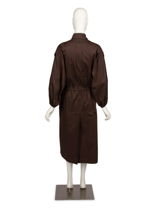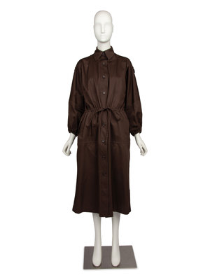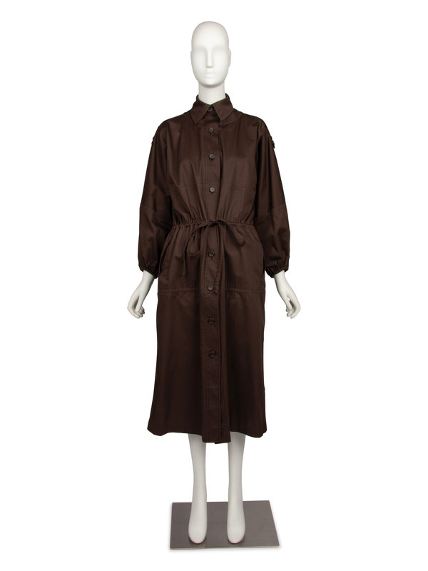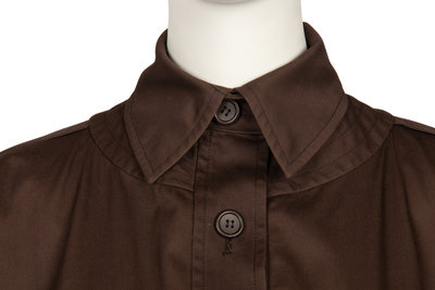 Brown cotton dress with standard collar, long and wide sleeves with self-fabric epaulettes, gathered waistband, and center front button closure.