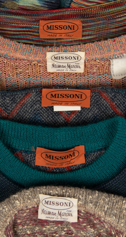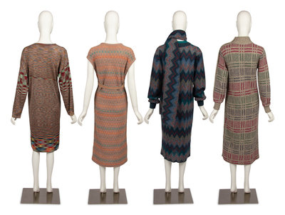 Blue and multicolored wool-blend knit dress in a zig-zag pattern with self-knit scarf, with double ripped crew neckline with set in sleeve and ribbed cuff.