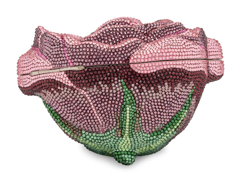 Pink rose with green underside minaudière encrusted with pink and green crystals on a silver-tone metal frame with silver leather lining and side pressure clasp closure. The bag retains the retail label listing the price at $5995.00.