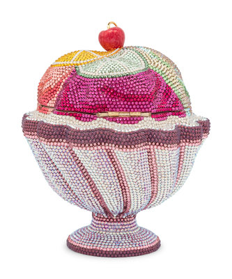 Fancy bowl of sorbet with fruit on top minaudière encrusted with multicolored crystals with a metal cherry on top on a gold-tone metal frame with a gold leather lining, detachable retractable chain strap, and side pressure clasp closure.