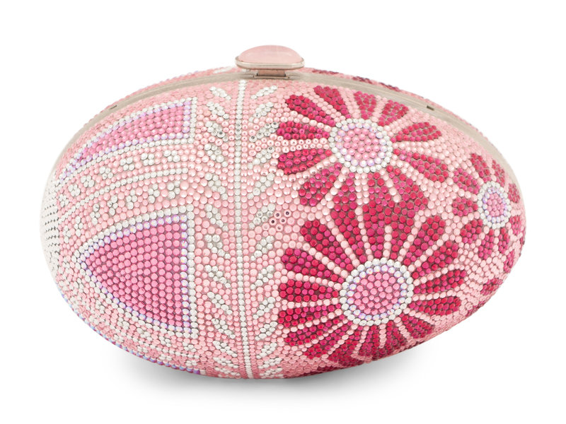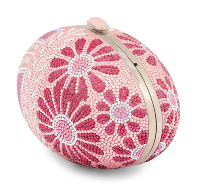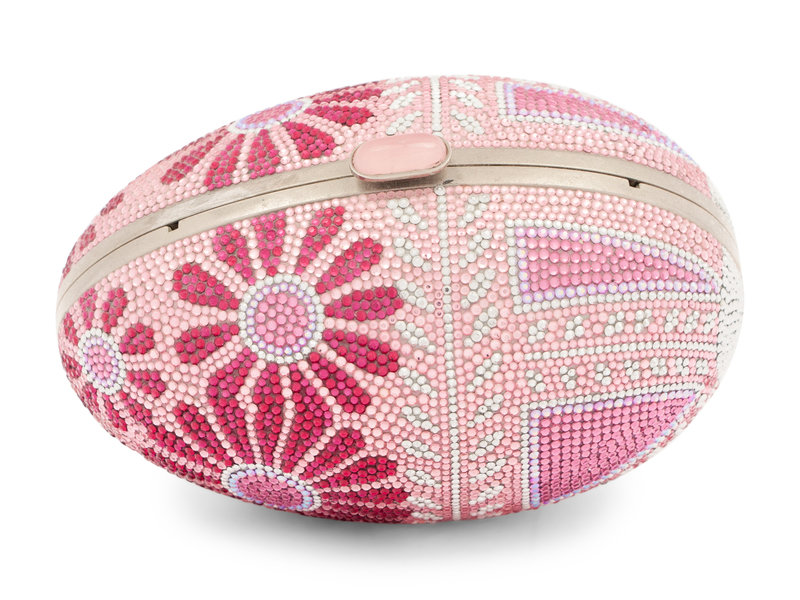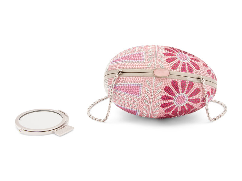 Floral and geometric pink egg minaudière encrusted with pink, red, and silver crystals on a silver-tone metal frame with silver leather lining, detachable retractable chain strap, and top pressure clasp closure. Bag retains the retail label listing the price at $3895.00.