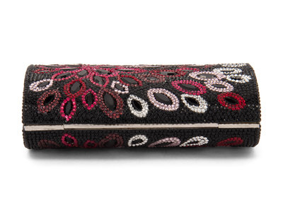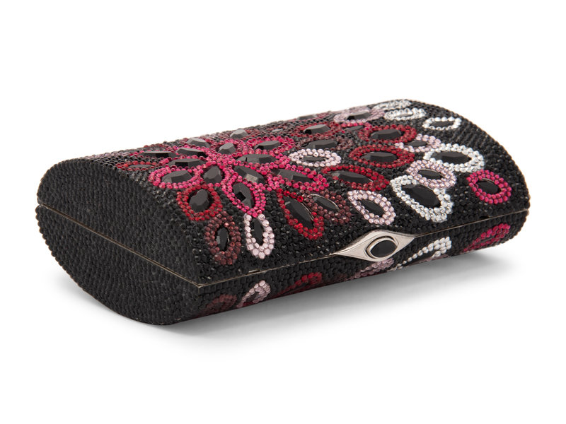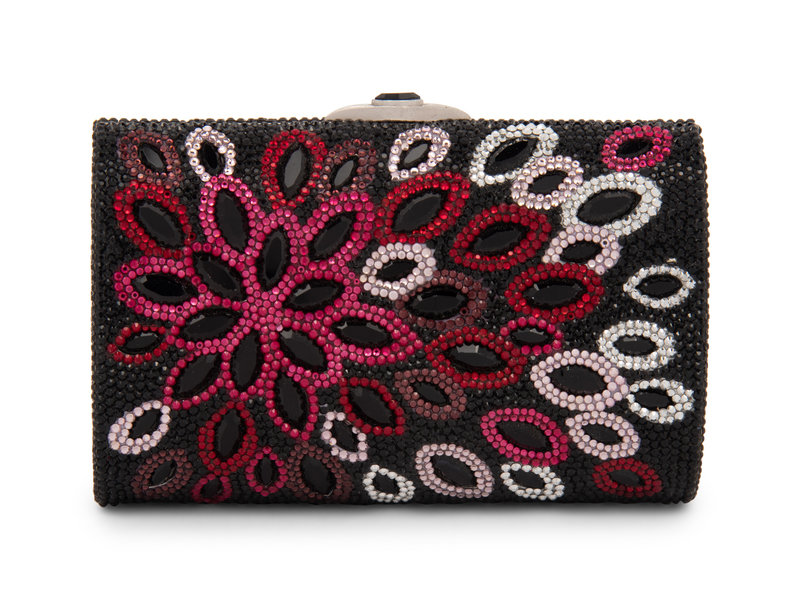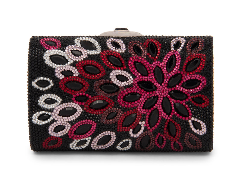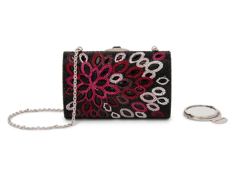 Floral crystal minaudière clutch encrusted with black, pink, red, and silver crystals on a silver-tone metal frame with siler leather lining, retractable chain strap, and a top pressure clasp closure.