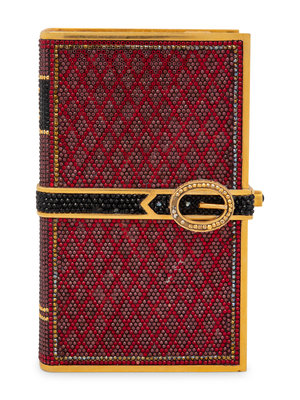 Three belted books minaudière encrusted with red, black, and gold crystals on a gold-tone frame with gold leather lining, a detachable chain strap and side pressure clasp closure.