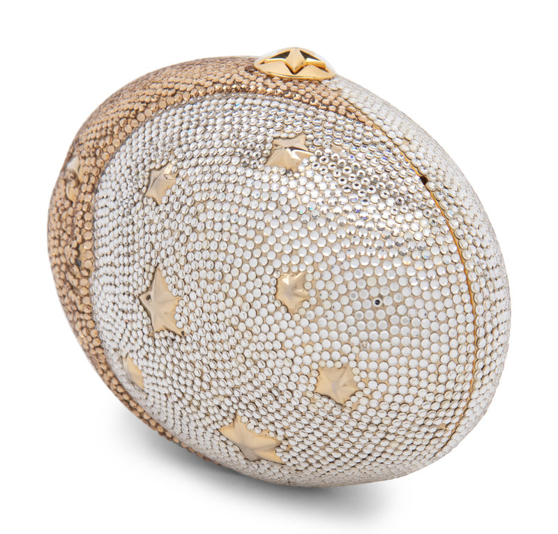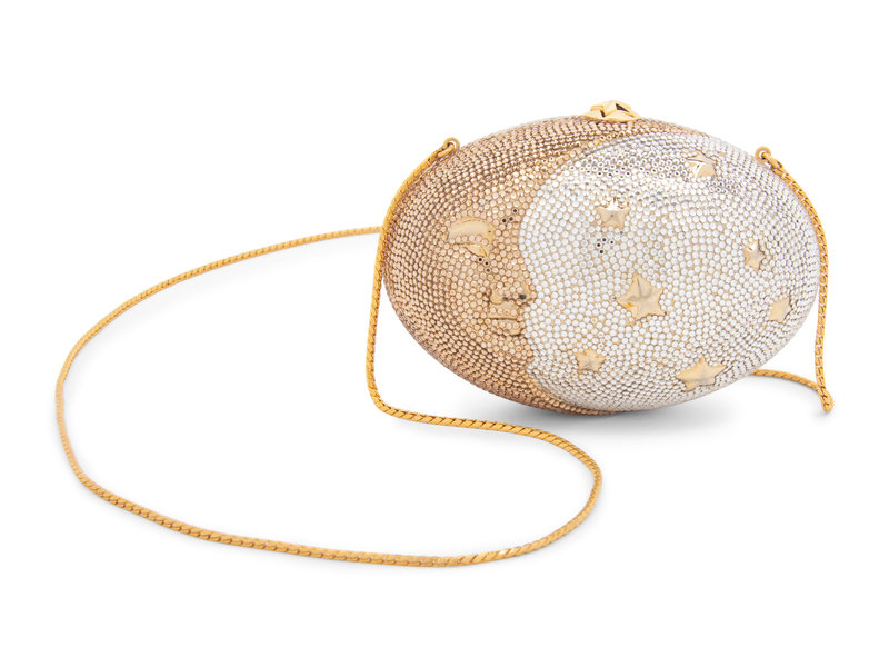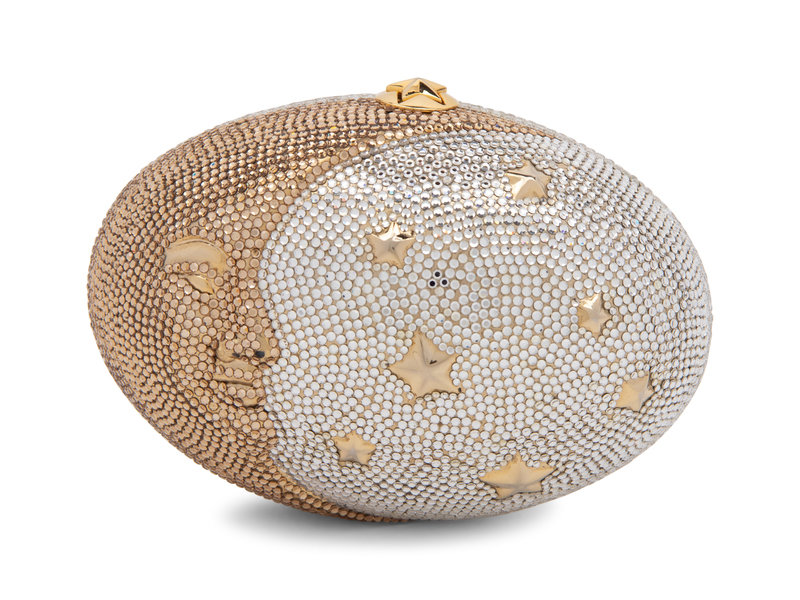 Moon and stars minaudière encrusted with silver and gold crystals and gold-tone metal stars on a gold-tone metal frame, with a metallic gold leather lining, a retractable chain strap, and a top pressure star clasp closure. Bag retains the retail label listing the price at $1650.00.