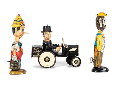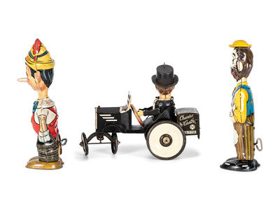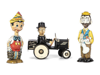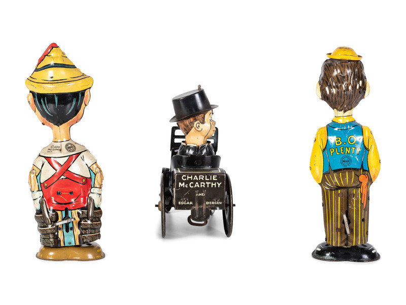 comprising a 'Pinocchio' figure, a 'B.O. Plenty' figure, and a 'Charlie McCarthy Whoopee Car.'